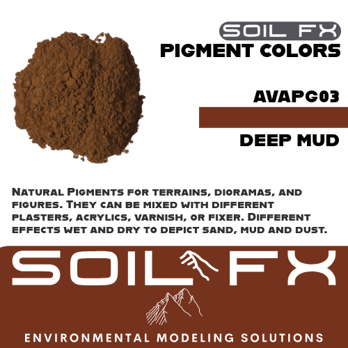 Natural Pigments for terrains, dioramas, and figures. They can be mixed with different plasters, acrylics, varnish, or fixer. Different effects wet and dry to depict sand, mud and dust.